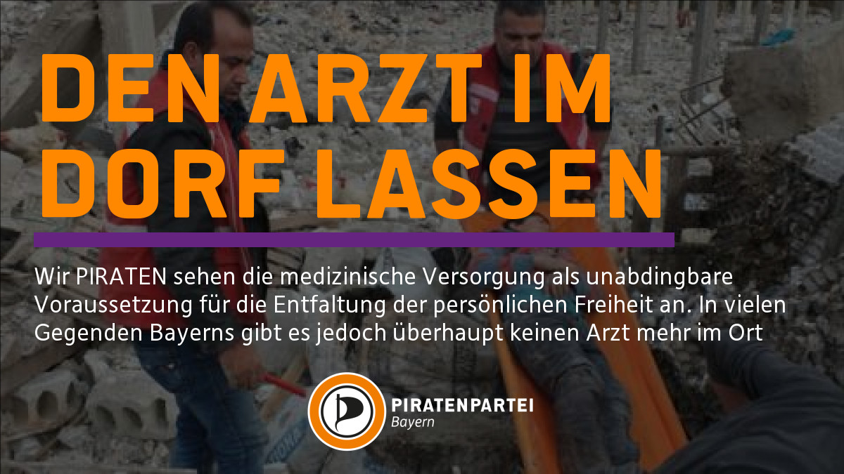 Wir PIRATEN sehen die medizinische Versorgung als unabdingbare Voraussetzung für die Entfaltung der persönlichen Freiheit an. In vielen Gegenden Bayerns gibt es jedoch überhaupt keinen Arzt mehr im Ort, so dass selbst bei kleineren Beschwerden weite Wege zurückgelegt werden müssen, während es in den größeren Städten des Landes zu einer Überversorgung gekommen ist.