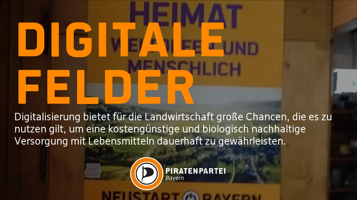 Zur Nutzung der Digitalisierungsmöglichkeiten in der Landwirtschaft wie beispielsweise präzise Feuchtigkeitsmessungen ist die flächendeckende Bereitstellung des 5G-Netzes von ausschlaggebender Bedeutung. Wir PIRATEN setzen uns daher dafür ein, dass das 5G-Netz bis 2021 flächendeckend in Bayern zur Verfügung steht.